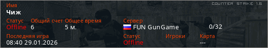 Играет на Counter Strike 1.6 сервере. Страна: РоссияПервый раз замечен 08:23 29.01.2026