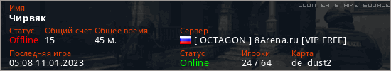 Играет на Counter Strike Source сервере. Страна: РоссияПервый раз замечен 22:10 10.01.2023