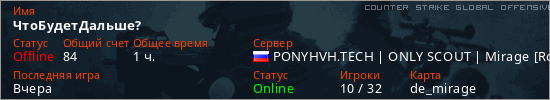 Играет на Counter Strike Global Offensive сервере. Страна: РоссияПервый раз замечен 15:19 07.04.2026