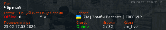 Играет на Counter Strike 1.6 сервере. Страна: УкраинаПервый раз замечен 22:53 17.03.2026