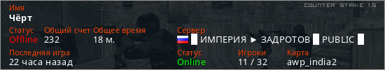 Играет на Counter Strike 1.6 сервере. Страна: РоссияПервый раз замечен 16:30 11.04.2026