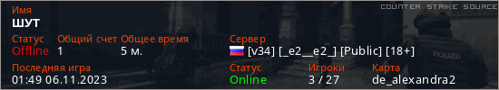 Играет на Counter Strike Source сервере. Страна: РоссияПервый раз замечен 01:47 06.11.2023