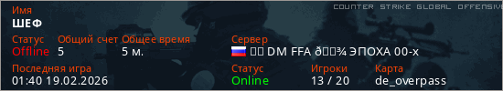 Играет на Counter Strike Global Offensive сервере. Страна: РоссияПервый раз замечен 01:38 19.02.2026