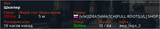 Играет на Counter Strike Source сервере. Страна: РоссияПервый раз замечен 19:20 06.12.2025