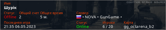 Играет на Counter Strike Source сервере. Страна: РоссияПервый раз замечен 21:33 06.05.2023