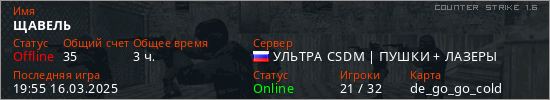 Играет на Counter Strike 1.6 сервере. Страна: РоссияПервый раз замечен 17:44 16.02.2025