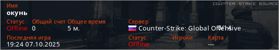 Играет на Counter Strike Source сервере. Страна: РоссияПервый раз замечен 19:01 07.10.2025