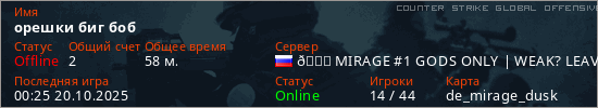 Играет на Counter Strike Global Offensive сервере. Страна: РоссияПервый раз замечен 21:51 02.09.2025