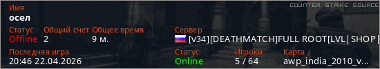 Играет на Counter Strike Source сервере. Страна: РоссияПервый раз замечен 14:46 17.04.2026