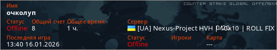 Играет на Counter Strike Global Offensive сервере. Страна: УкраинаПервый раз замечен 16:50 13.01.2026