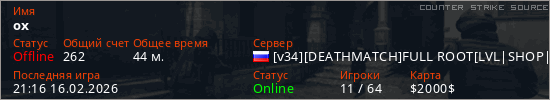 Играет на Counter Strike Source сервере. Страна: РоссияПервый раз замечен 17:33 15.02.2026