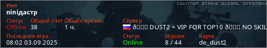 Играет на Counter Strike Global Offensive сервере. Страна: РоссияПервый раз замечен 02:09 15.02.2025