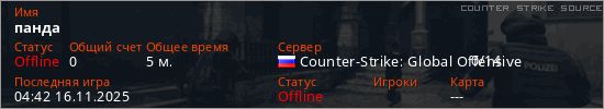 Играет на Counter Strike Source сервере. Страна: РоссияПервый раз замечен 04:34 16.11.2025