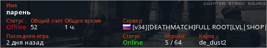 Играет на Counter Strike Source сервере. Страна: РоссияПервый раз замечен 18:26 26.02.2026