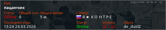Играет на Counter Strike 1.6 сервере. Страна: РоссияПервый раз замечен 13:22 24.03.2026