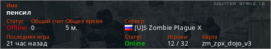 Играет на Counter Strike 1.6 сервере. Страна: РоссияПервый раз замечен 16:21 21.12.2025