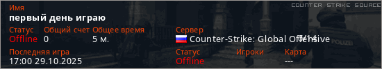 Играет на Counter Strike Source сервере. Страна: РоссияПервый раз замечен 16:56 29.10.2025