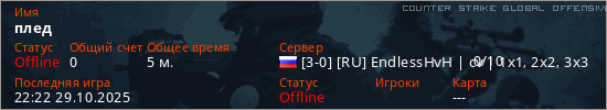 Играет на Counter Strike Global Offensive сервере. Страна: РоссияПервый раз замечен 21:57 29.10.2025