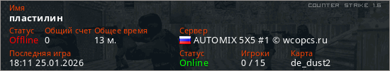 Играет на Counter Strike 1.6 сервере. Страна: РоссияПервый раз замечен 21:17 24.01.2026