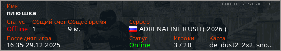 Играет на Counter Strike 1.6 сервере. Страна: РоссияПервый раз замечен 15:39 29.12.2025