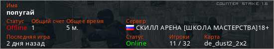 Играет на Counter Strike 1.6 сервере. Страна: РоссияПервый раз замечен 13:10 29.12.2025