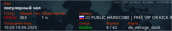 Играет на Counter Strike Global Offensive сервере. Страна: РоссияПервый раз замечен 19:53 05.06.2025