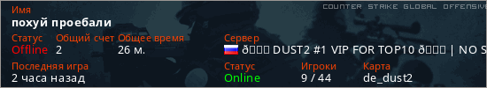 Играет на Counter Strike Global Offensive сервере. Страна: РоссияПервый раз замечен 20:15 26.04.2025