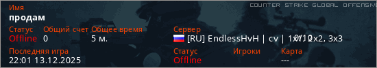 Играет на Counter Strike Global Offensive сервере. Страна: РоссияПервый раз замечен 21:55 13.12.2025