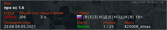 Играет на Counter Strike 1.6 сервере. Страна: РоссияПервый раз замечен 15:40 25.10.2020