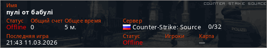 Играет на Counter Strike Source сервере. Страна: РоссияПервый раз замечен 21:11 11.03.2026
