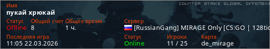 Играет на Counter Strike Global Offensive сервере. Страна: РоссияПервый раз замечен 09:57 06.03.2026