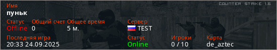 Играет на Counter Strike 1.6 сервере. Страна: РоссияПервый раз замечен 20:29 24.09.2025