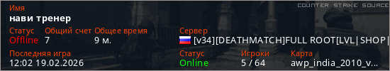 Играет на Counter Strike Source сервере. Страна: РоссияПервый раз замечен 15:19 18.02.2026