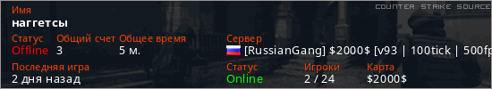 Играет на Counter Strike Source сервере. Страна: РоссияПервый раз замечен 11:10 05.04.2026