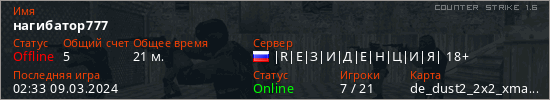 Играет на Counter Strike 1.6 сервере. Страна: РоссияПервый раз замечен 14:42 04.11.2023