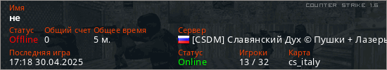 Играет на Counter Strike 1.6 сервере. Страна: РоссияПервый раз замечен 17:08 30.04.2025