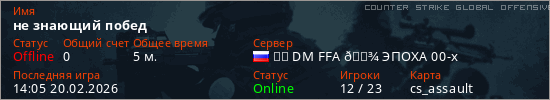 Играет на Counter Strike Global Offensive сервере. Страна: РоссияПервый раз замечен 14:03 20.02.2026