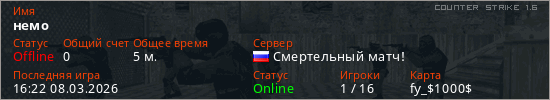 Играет на Counter Strike 1.6 сервере. Страна: РоссияПервый раз замечен 15:59 08.03.2026