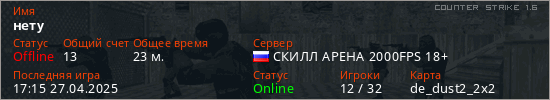 Играет на Counter Strike 1.6 сервере. Страна: РоссияПервый раз замечен 10:44 23.02.2023
