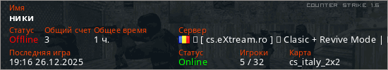 Играет на Counter Strike 1.6 сервере. Страна: РумынияПервый раз замечен 19:36 07.11.2025