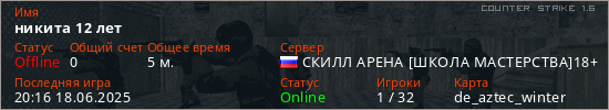 Играет на Counter Strike 1.6 сервере. Страна: РоссияПервый раз замечен 20:02 18.06.2025