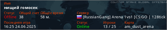 Играет на Counter Strike Global Offensive сервере. Страна: РоссияПервый раз замечен 16:44 07.06.2025
