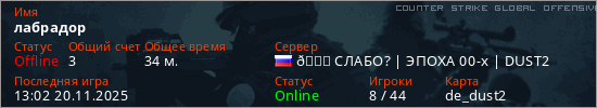 Играет на Counter Strike Global Offensive сервере. Страна: РоссияПервый раз замечен 08:01 19.11.2025