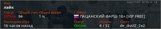 Играет на Counter Strike 1.6 сервере. Страна: РоссияПервый раз замечен 12:38 15.03.2026