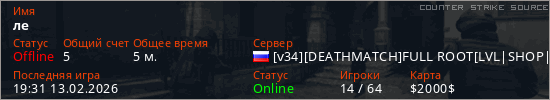 Играет на Counter Strike Source сервере. Страна: РоссияПервый раз замечен 19:21 13.02.2026