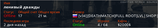 Играет на Counter Strike Source сервере. Страна: РоссияПервый раз замечен 21:42 29.03.2026