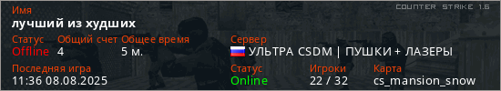 Играет на Counter Strike 1.6 сервере. Страна: РоссияПервый раз замечен 11:22 08.08.2025
