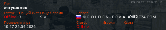 Играет на Counter Strike 1.6 сервере. Страна: РоссияПервый раз замечен 08:15 25.04.2026