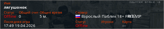 Играет на Counter Strike 1.6 сервере. Страна: РоссияПервый раз замечен 17:47 19.04.2026