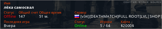 Играет на Counter Strike Source сервере. Страна: РоссияПервый раз замечен 12:45 04.07.2025